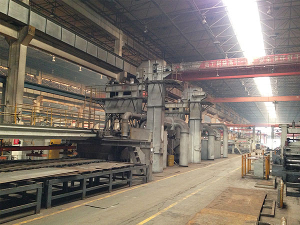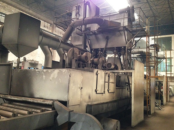 本拋丸裝置設有16臺拋丸器,上下對稱分布。拋丸作用力均勻,清理效果顯著,是防止薄板拋丸變形最有效的設備。
